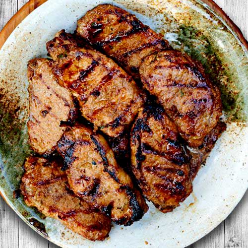 Marinated chicken breast cuts, char-grilled on skewer, served with salad