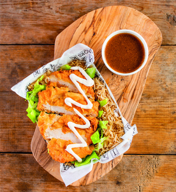Peri peri chicken fillet, cheddar cheese, tomatoes, lettuce served with chips.