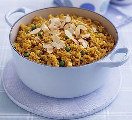 Pan fried smokes sausages and rice cooked with mixed vegetables (260 kcal)