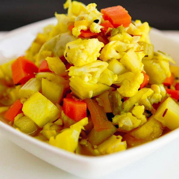 Suitable for vegetarians. Smoked aubergine, eggs, garlic, turmeric, and tomatoes with olive oil. Vegetarian