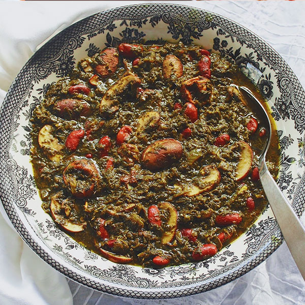 All traditional Persian garden herbs slow-cooked with diced lamb fillet, sun-dried lime, and red beans, served with saffron rice
