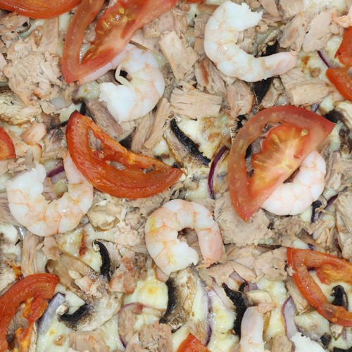 Tomato Sauce, Mozzarella, Tuna, Prawns, Anchovies and Chopped Tomatoes