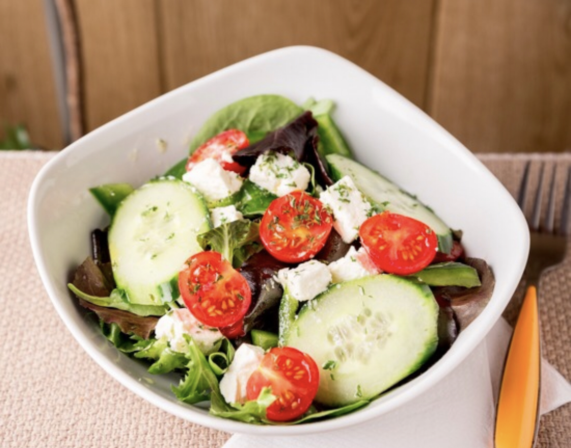Lettuce, rocket, red onion, cucumber, black olives, lemon juice and olive oil
