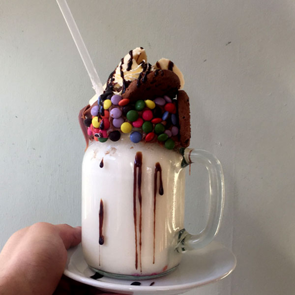 A fresh golden waffle drizzled with milk chocolate saucetopped with smarties and more smarties and finished withchocolate sauce with a scoop of kellys vanilla bean ice cream