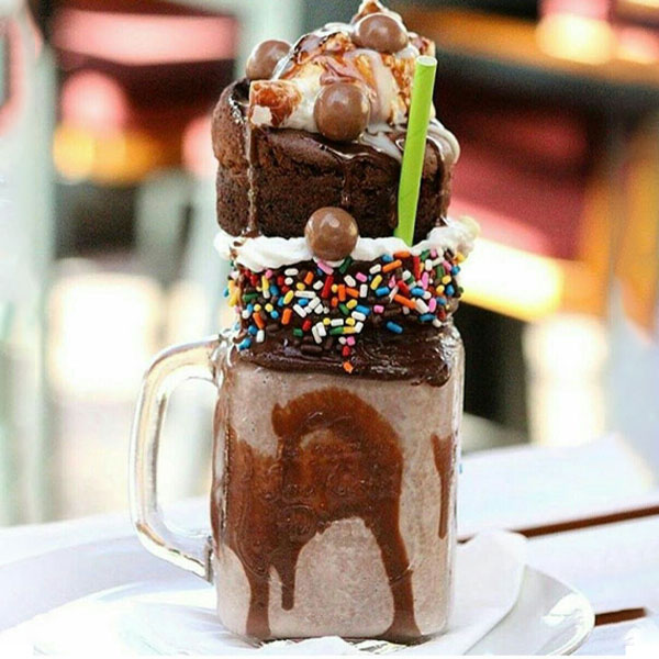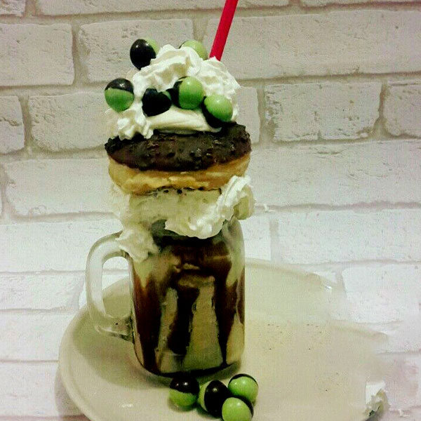 Double chocolate chip cookie dough with milk chocolate sauce and white chocolate sauce, an explosion of oreo chunks and ferrero pieces, served with a scoop of kelly’s ice cream.