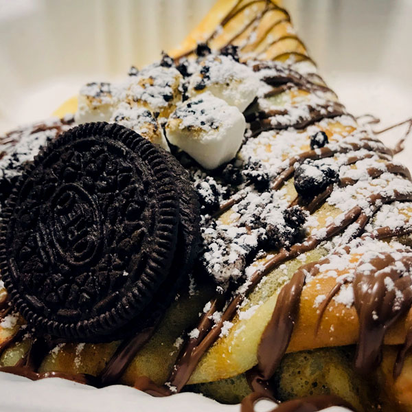 Crepe covered in white chocolate sauce and an explosion of oreo pieces, topped with milk chocolate, served with a scoop of kelly’s vanilla bean ice cream.
