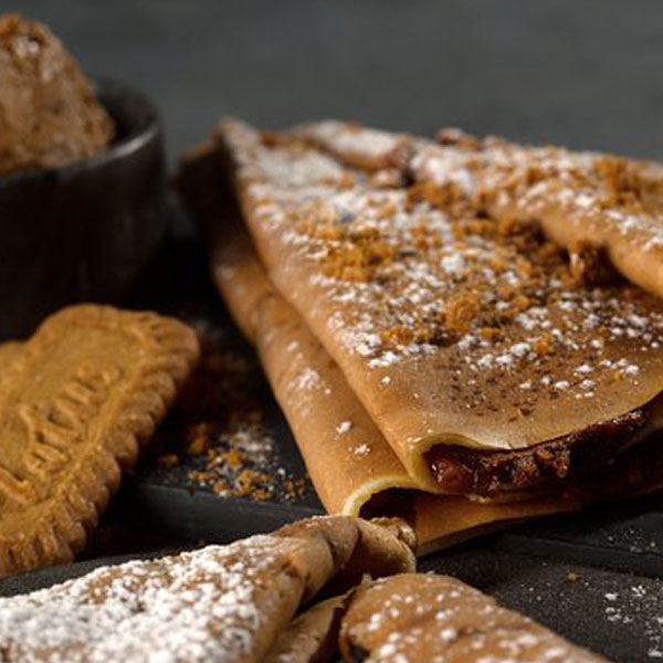 Crepe with lotus biscoff spread, a dashing of crushed lotus biscoff biscuits and drizzled in lotus biscoff sauce served with a scoop of kelly’s ice cream.