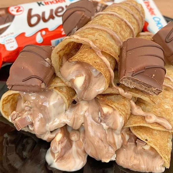 Crepe topped with white chocolate sauce and pieces of Kinder Bueno (white) served with a scoop of kelly’s vanilla bean ice cream.