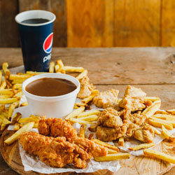 3pcs chicken strips, 4pcs chicken popcorn ,chips and drink