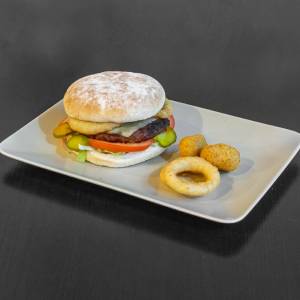 Served with soft bap bun, crispy fried chicken fillet, special hot burger sauce, cheese, chips and drink