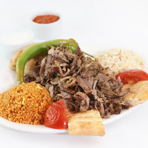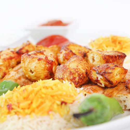 Cubes of lamb and chicken marinated in olive oil and lemon juice , herbs and seasoning. cooked in charcoal grill