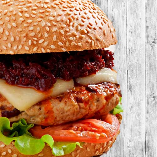 Chicken fillet burger ,cheddar cheese topped with smoky sausages,served with lettuce and mayo.