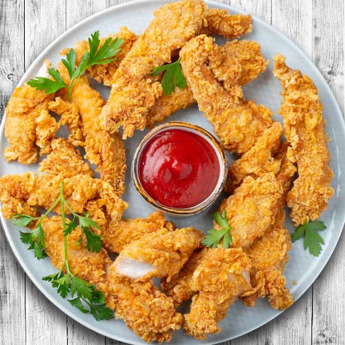 4 Chicken strips, 4 BBQ wings, 4 hot wings & curly fries