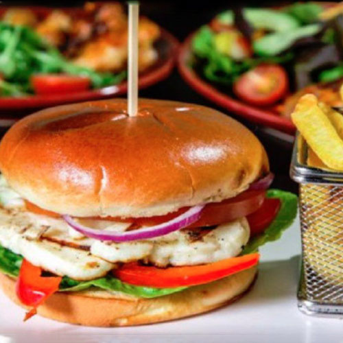 Grilled beef burger, bacon, served with cheese & salad