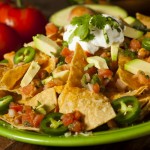 Tortilla chips topped with salsa sauce, mozzarella, and jalapenos.