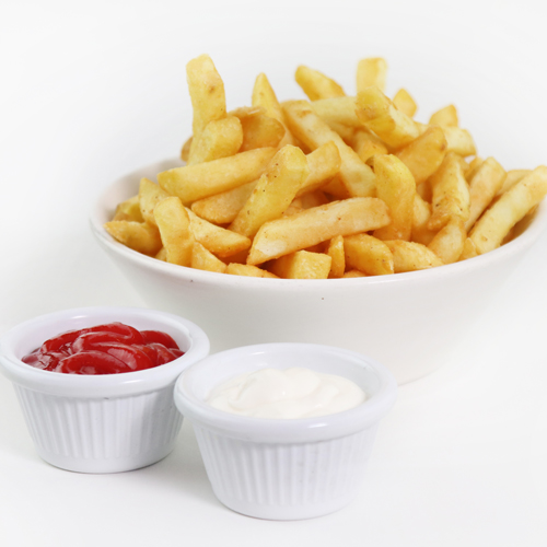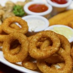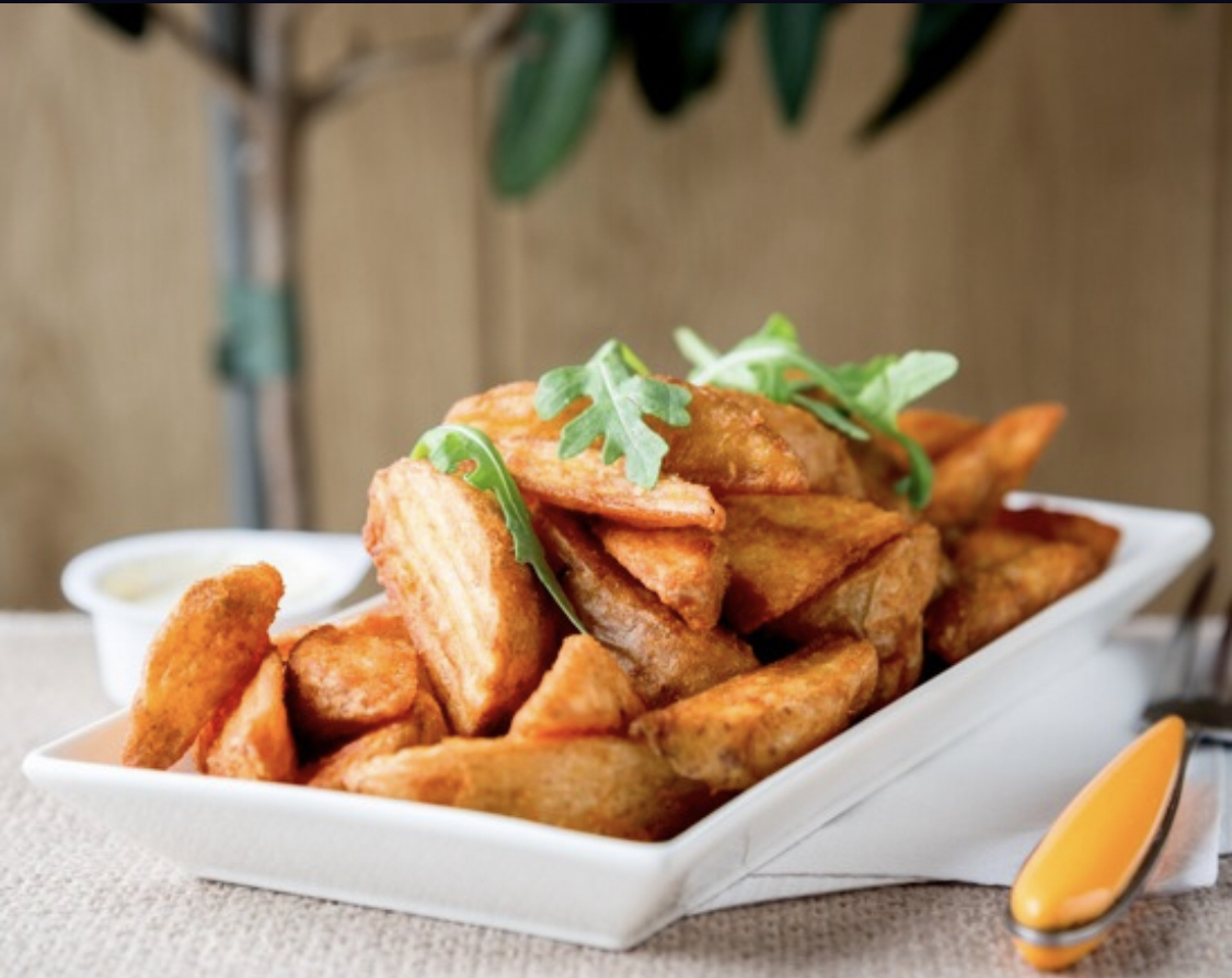 10 Onion rings, 4 chicken dippers, 4 chicken nuggets, 1 portion of potato wedges, 4pcs garlic bread & 2 dips