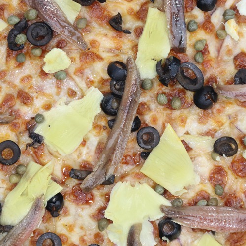 Artichoke, olives, mushrooms, sliced ham and mozzarella