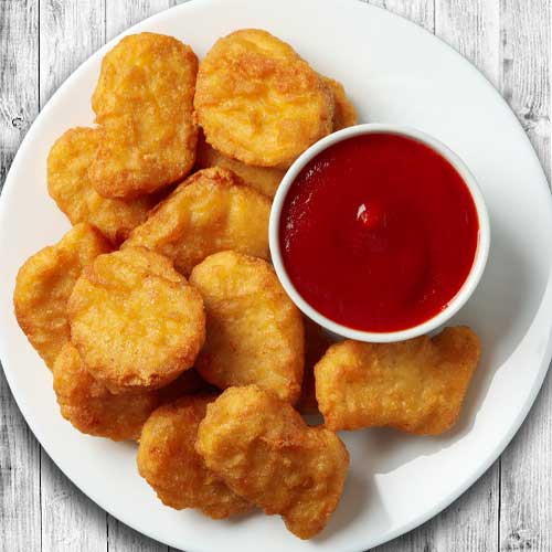 Minced chicken compressed together, carved into slices and served in a box with pitta bread, salad and onions.